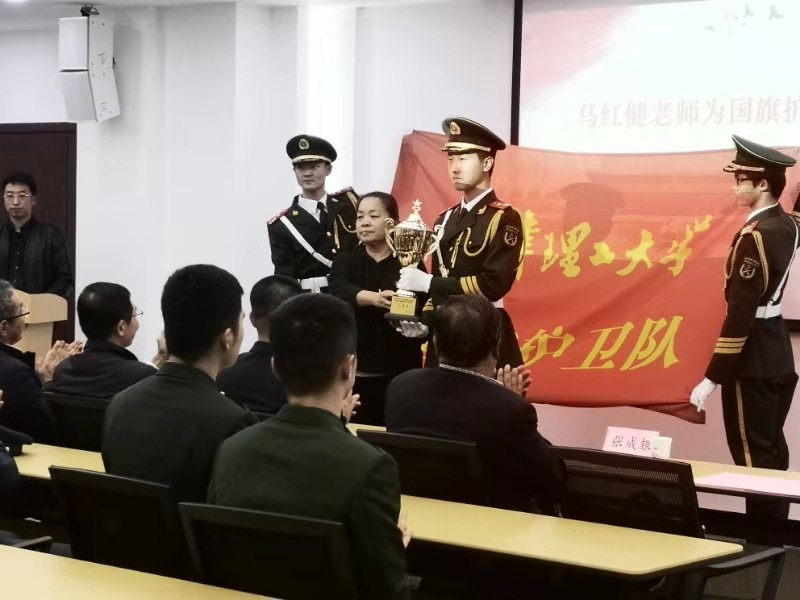在随后进行的在国旗护卫队成立仪式上,人民武装部负责同志宣读了天津理工大学国旗护卫队成立决定,在场师生一同观看了天津市高校国旗护卫队展演的精彩回放,并为护卫队颁发了展演二等奖的奖杯。